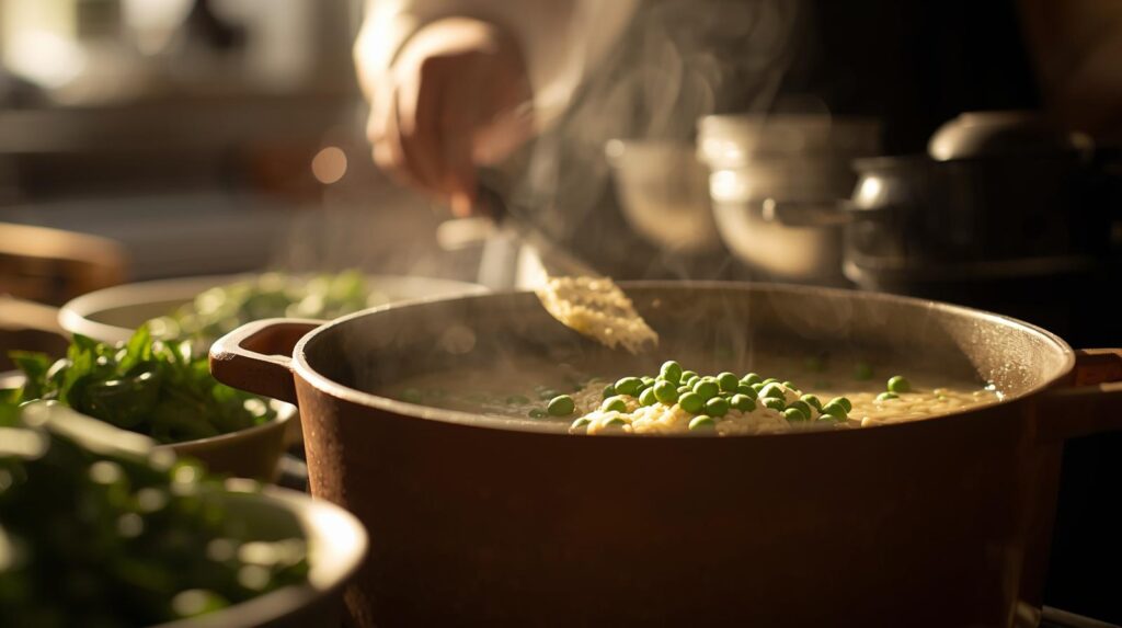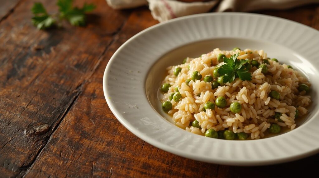 La ricetta tradizionale prevede che il riso venga cotto lentamente, assorbendo il brodo e amalgamandosi perfettamente con i piselli.